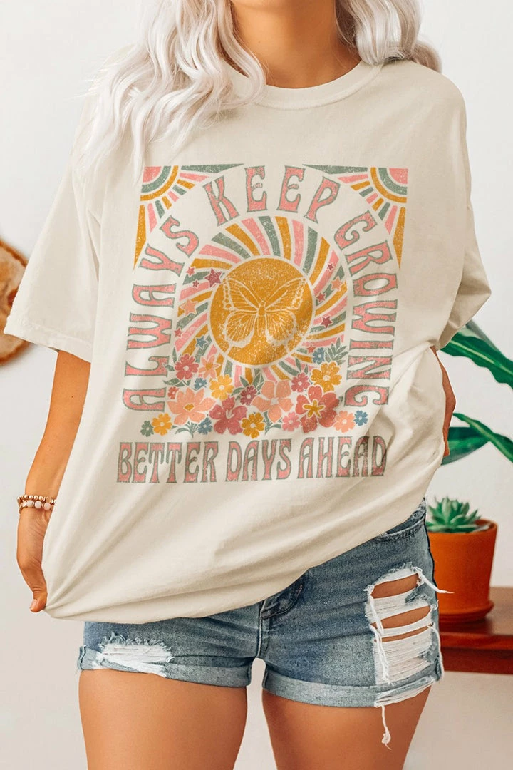 We have found the sweetest graphic tee! Oversized fit in vintage white, featuring heavy distressed retro typography ‘Always Keep Growing, Better Days Ahead’ with multi color sun and an illustration of flowers and a butterfly in spring colors. Too perfect!!