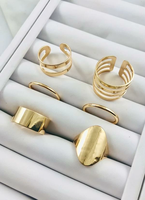 This set of rings includes two simple bands and four statement rings.