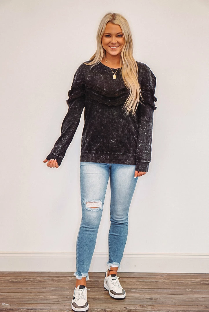 We are in love with this black charcoal french terry lightweight pullover! So comfy, and super cute! Featuring our favorite mineral washed fabric, relaxed fit, and frayed fringe details across the front and around the shoulders in back. You will love how great you feel in this babe. Perfect for all of the places life takes you!