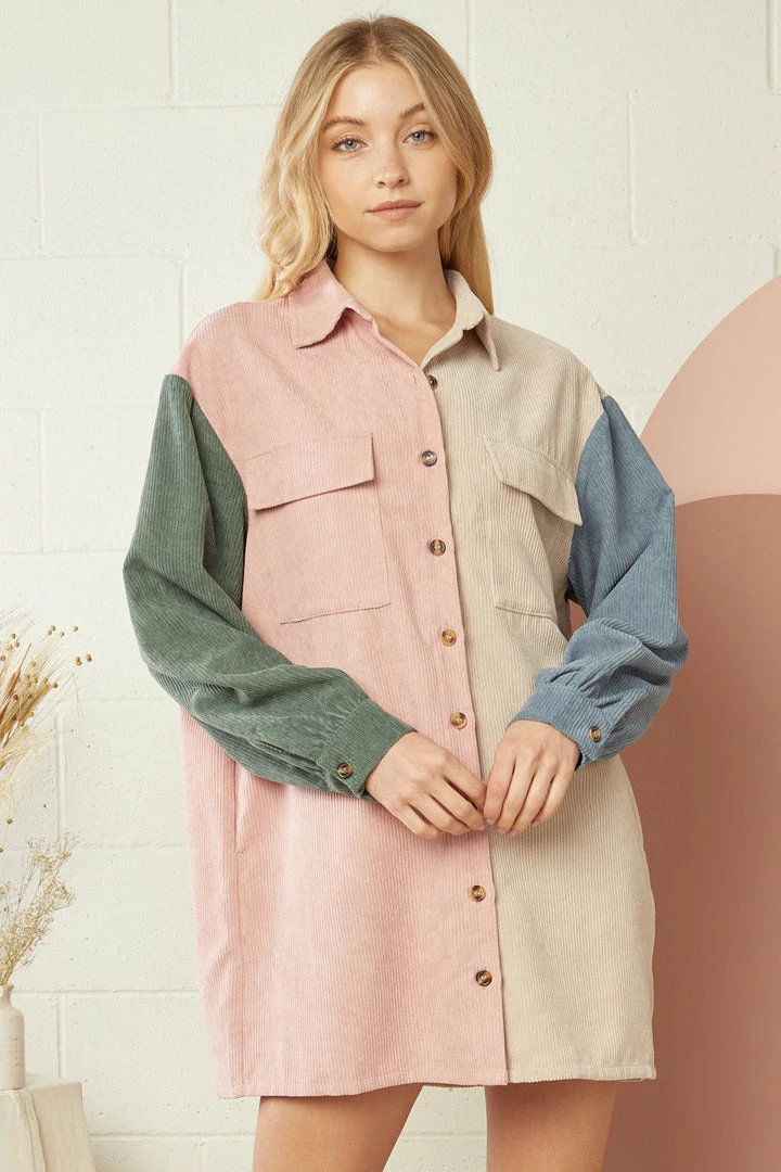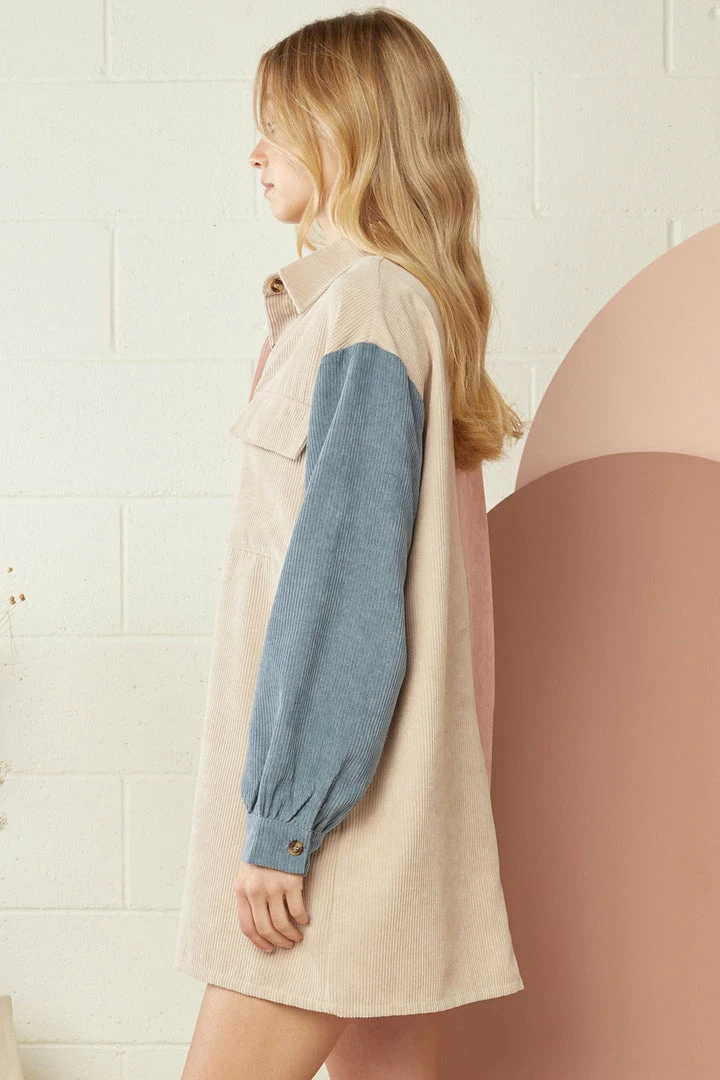 Corduroy is an American classic, and you will love this new twist on the classic style with this really sweet colorblock dress. Featuring button front closure, button cuffed long sleeves, chest pockets, and colorblock colors of blush, taupe, blue, and olive. Just throw on your favorite booties, and you’ll be ready for all of your upcoming Autumn events.