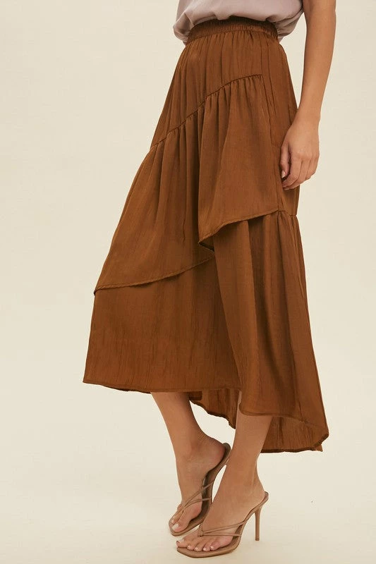 This skirt is simple, yet perfect! You can totally change this satin tiered skirt up and style it sooo many ways! The caramel color makes for a year ’round staple. Features a stretch elastic waistband, which we all love, asymmetrical tiered layers, and a lightweight crinkle satin fabric!