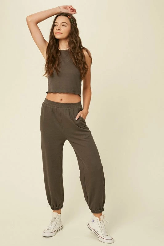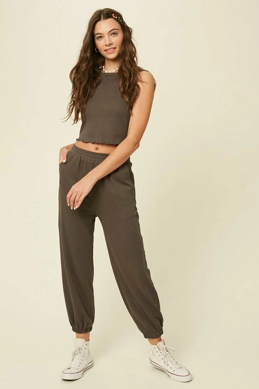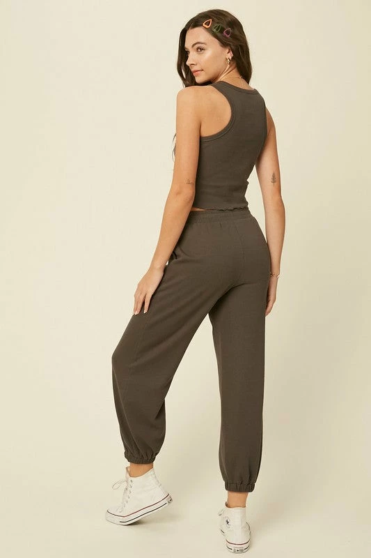 How cute is this set?? Charcoal colored rib knit racer tank crop top and matching rib knit elastic waist joggers. This is the perfect outfit for working out, or lounging around with friends. Either way you’ll feel fabulous and comfy at the same time. Perfect for whatever your day brings!
