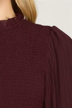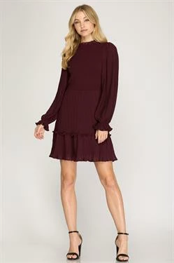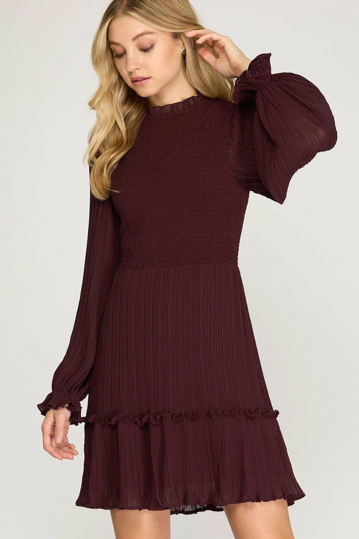 You’re going to love this one girls! Smocked dress, in a very pretty wine color. Featuring a smocked top and flowy bottom, a ruffled high neckline with a keyhole button closure in back, ruffle cuffed long sheer sleeves, a flowy pleated skirt, and a ruffled hem at the bottom. This beautiful babe is lined, and has a true to size fit. She’ll be perfect for any special occasion, from Wedding events, to Holiday parties, and the color will transition beautifully into the upcoming seasons.