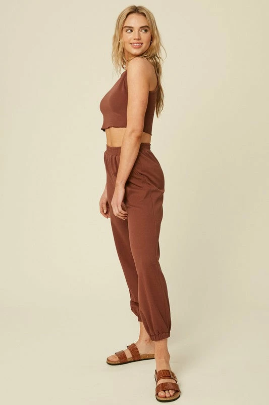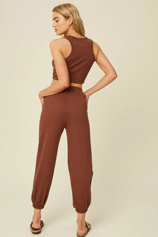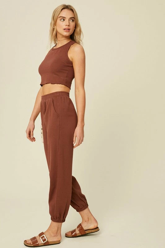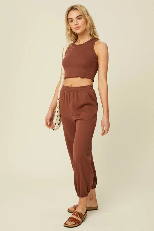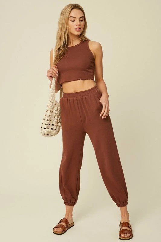 How cute is this set?? Chestnut colored rib knit racer tank crop top and matching rib knit elastic waist joggers. This is the perfect outfit for working out, or lounging around with friends. Either way you’ll feel fabulous and comfy at the same time. Perfect for whatever your day brings!