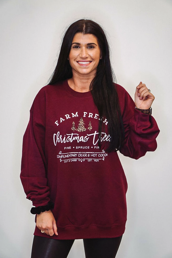 It’s beginning to look a lot like Christmas! We LOVE this Farm Fresh Christmas Trees graphic sweatshirt. Featuring a very pretty heathered burgundy color with crew neckline and cuffed long sleeves. Super cute and comfy!! We will be wearing this babe all season long.
