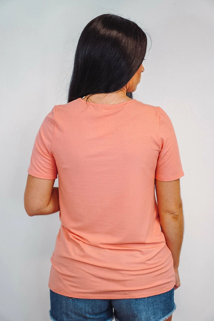 A classic top with a fun summer color you will see yourself always grabbing for! Basic knit blouse but with a TWIST! Top features a light ribbed fabric and cut out design. Pair with your favorite denim shorts for an easy and fun look!!
