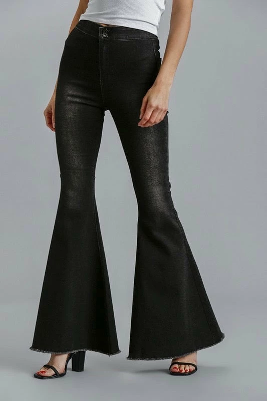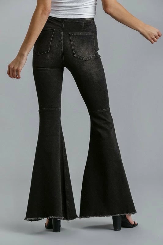 Black Denim High Rise Super Flared Jeans With Fringed Raw Edge