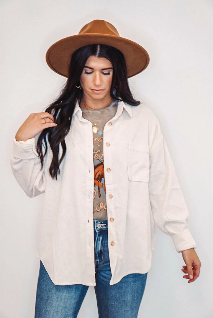 Nothing feels as comforting as a soft corduroy shirt! This cutie is an ivory corduroy button up, featuring a collar, double button cuffed long sleeves, rounded bottom hemline, and a front chest pocket. So perfect! This will be your favorite go to everyday!