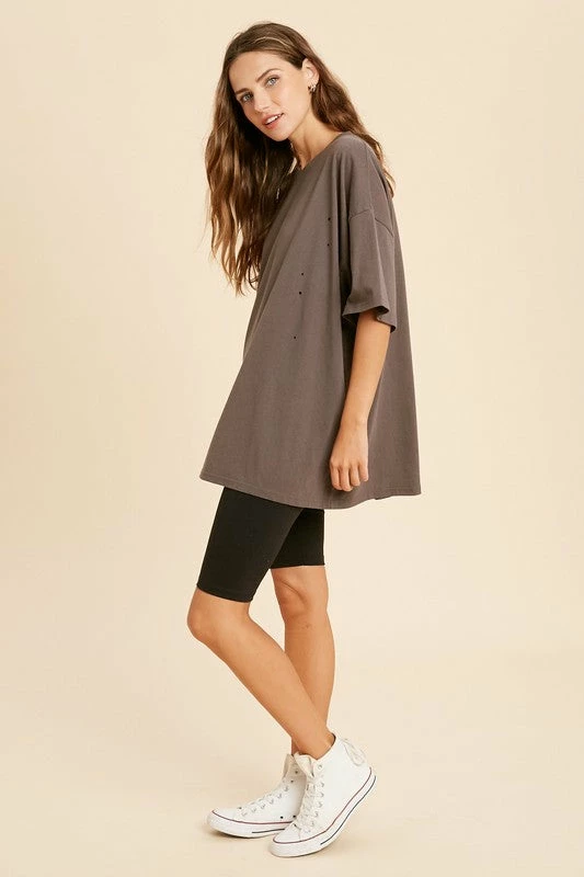 Charcoal Oversized Distressed Crew Neck Tee For Women.
