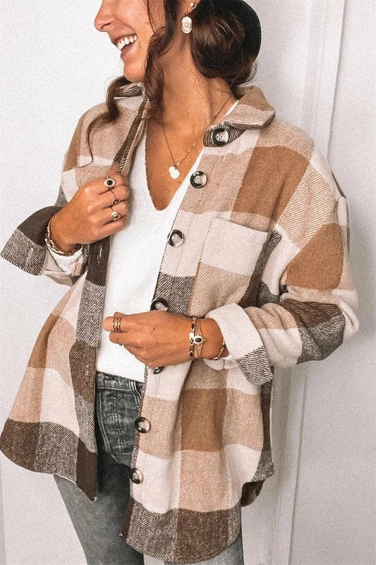 We are obsessed with this caramel, brown and tan checkered plaid flannel shacket! It is definitely a must have this season! Featuring a front chest pocket, button front closure, button cuffed long sleeves, and a soft fabric to keep you cozy and trendy. She’s be the perfect addition to your wardrobe, and will look adorable paired with boots and booties!