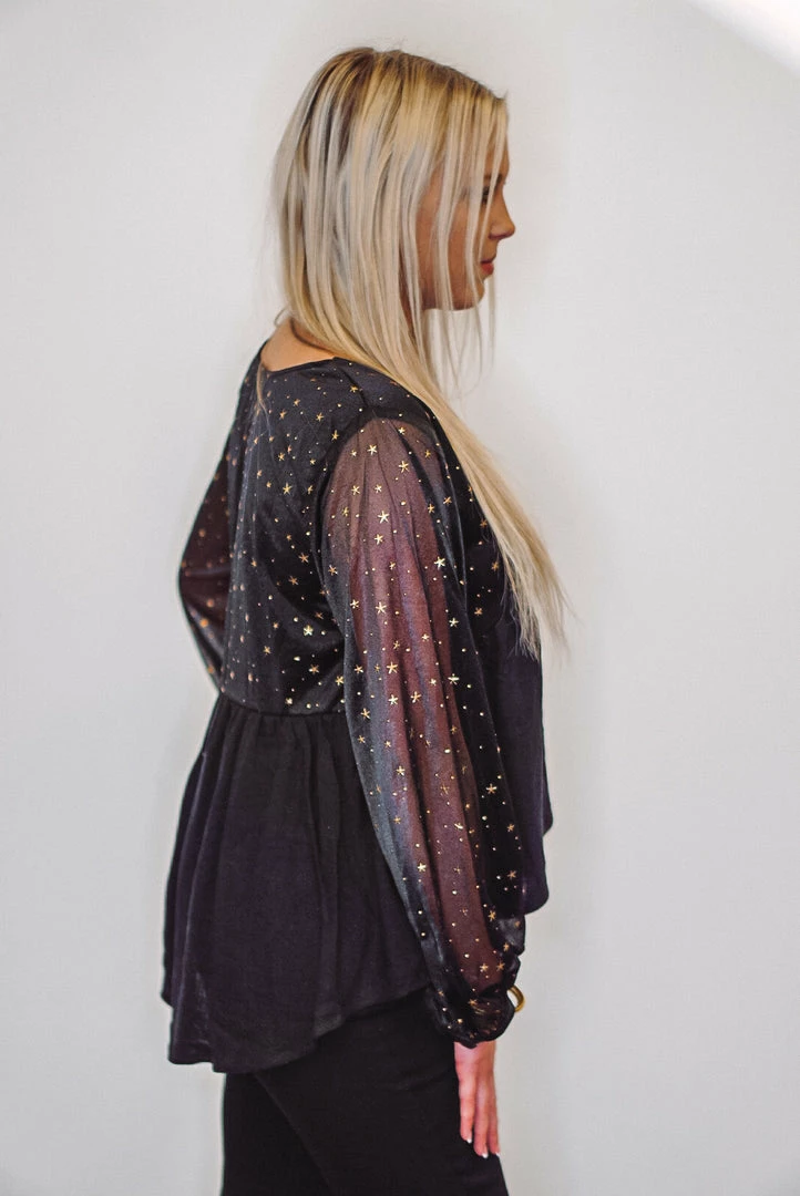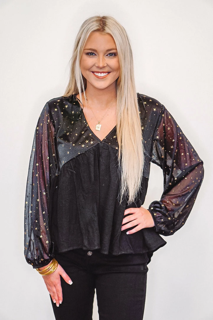Dreamy looks with this top! Featuring a unique sheer sleeve with gold stars throughout. Would be such a cute top for New Year events!