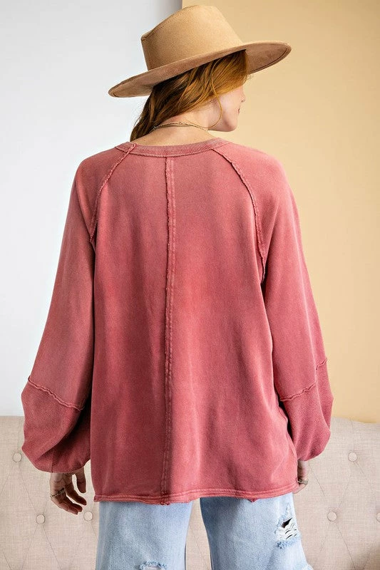 We are having all the feels for this strawberry cream french terry top! So comfy, and super cute! Featuring our favorite mineral washed fabric, relaxed fit, raw hemline and textured fabric details, cuffed balloon sleeves, and a slit at the bottom hemline on each side. You will love how great you feel in this babe, whether running errands, or enjoying a bonfire with friends.