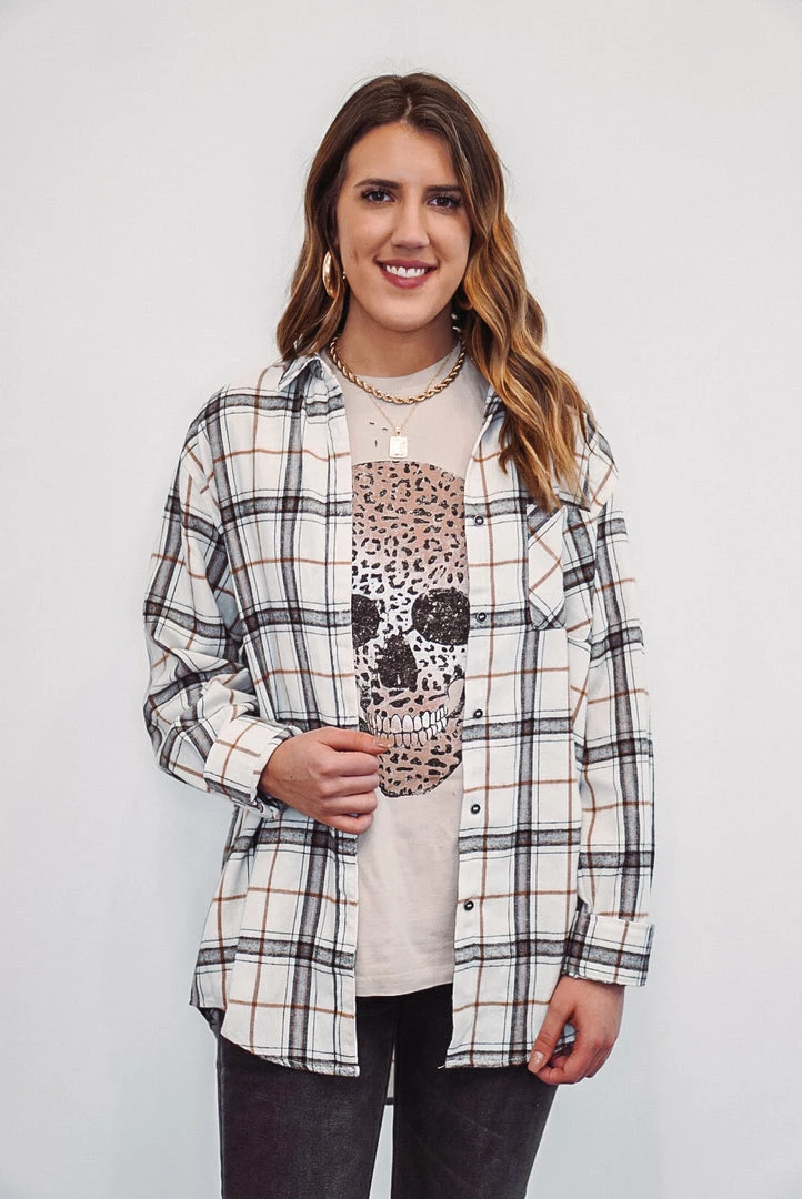 leopard print skull graphic top. Tee features distressing (small holes) throughout. Color is light taupe with black and mauve design. SHOP plaid flannel shirt HERE!