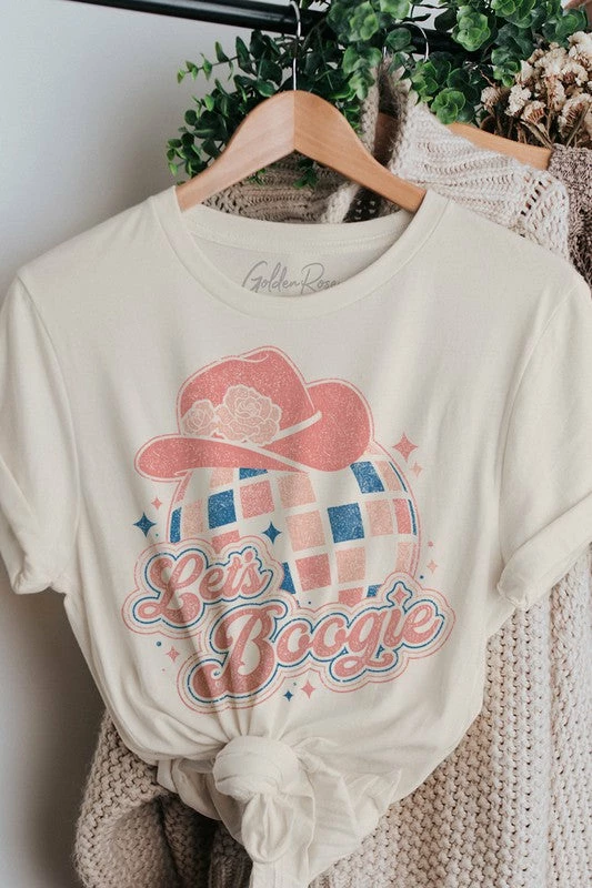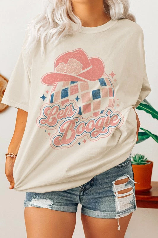 Let’s Boogie y’all!! Loose relaxed fit graphic tee in vintage white, featuring retro typography ‘Let’s Boogie’ and a vintage style cowgirl hat with roses on a multi color disco ball. Too perfect!!