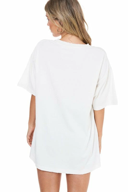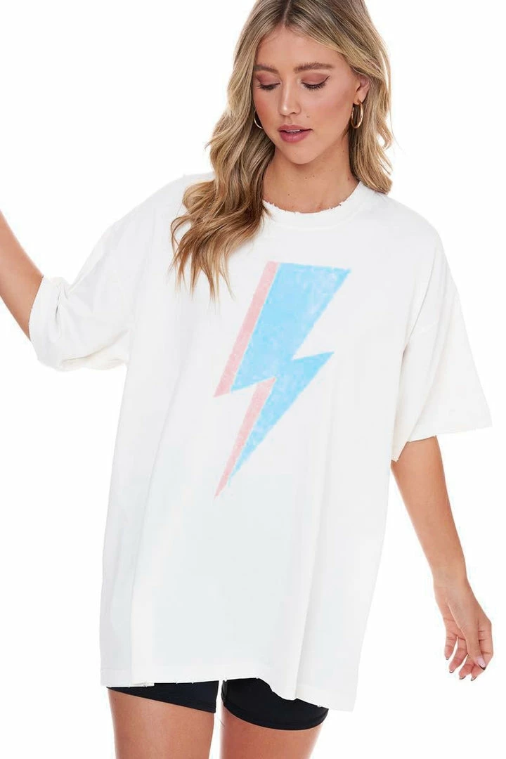 Trendy little must have tee! Graphic tee in ivory featuring a crew neckline, short sleeves, distressed hemlines, and a mauve/blue lightning bolt in vintage print. Perfect with some biker shorts!
