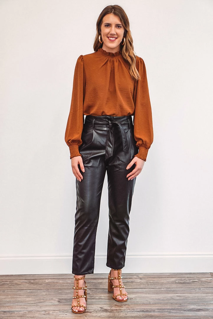The ruffled mock neck and smocked sleeves adds just the right amount of sass. This toffee top features a lightweight fabric that is great for layering, along with a relaxed silhouette. Super cute!