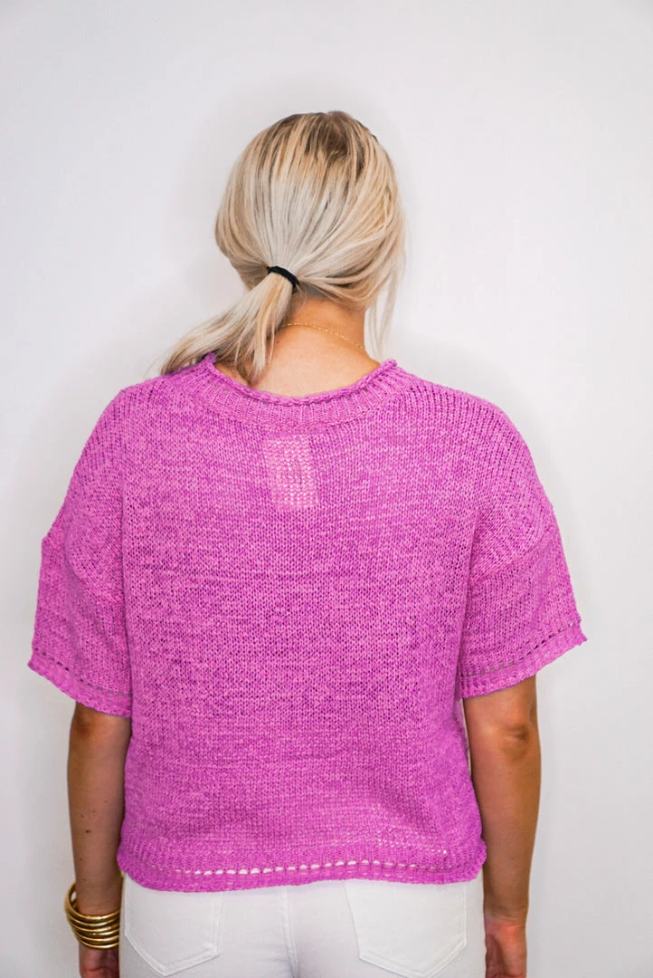 There is such a comfy classic feel to a loose knit Summer top. This cutie is an orchid lightweight loose knit fabric, featuring a ribbed crew neckline, and dropped shoulder with ribbed cuffed short sleeves. Perfect for those warm Summer evenings at the beach!
