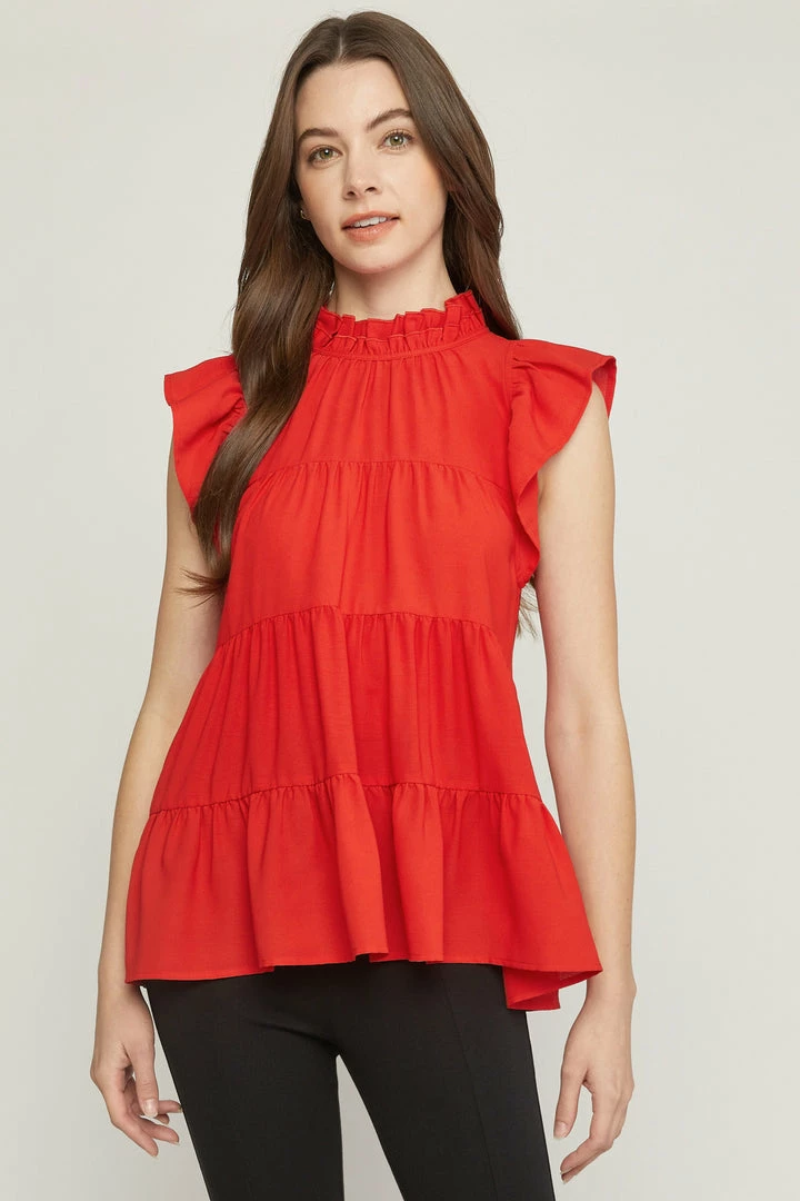 The perfect little top for all of your upcoming occasions… just add your favorite jeans and sandals or booties and you’re set. Solid top with a ruffled mock neckline that ties in the back, ruffled cap sleeves, and tiered layers. So cute!