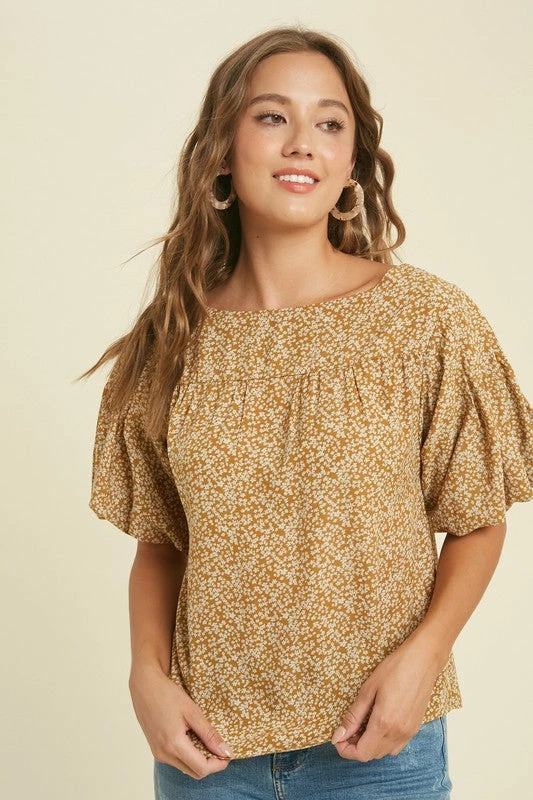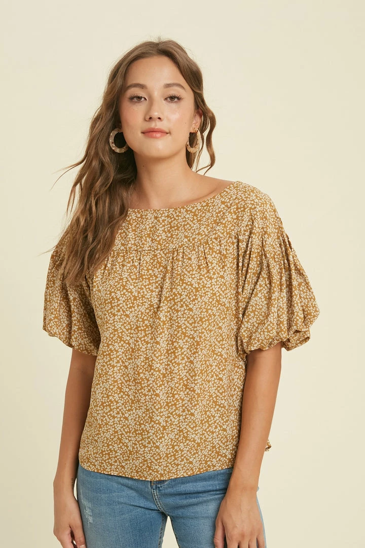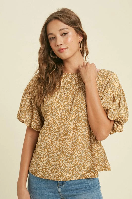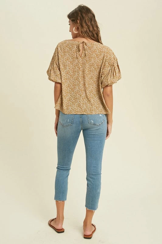 You won’t even have to try hard to dress this little number up..the puff sleeve gives an instant dressy look. The ultimate fall top to have! Features small ivory floral print design with a self tie back closure.