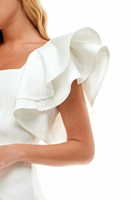 The perfect dress for brides or anyone who needs a gorgeous white dress for any occasion! Bridal shower, rehearsal dinner, graduation or just a special night out. You need this dress in your life. The fit and details are perfect. A sheath dress with an adorable ruffled sleeve.