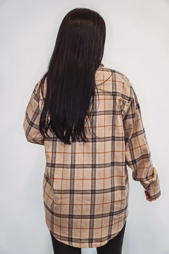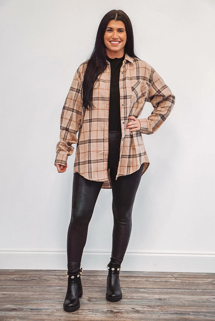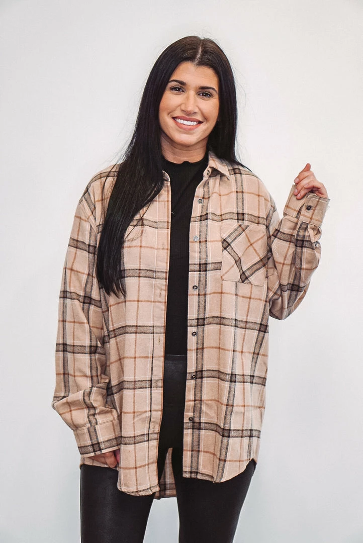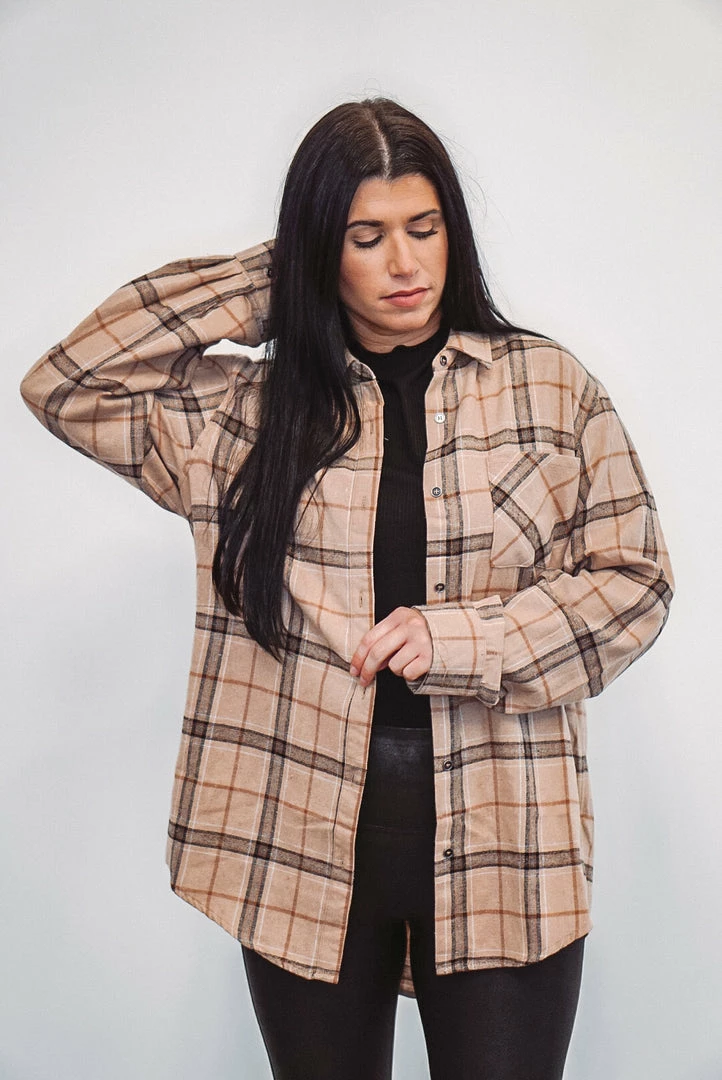 Tan, ivory, black and caramel plaid flannel oversized shirt