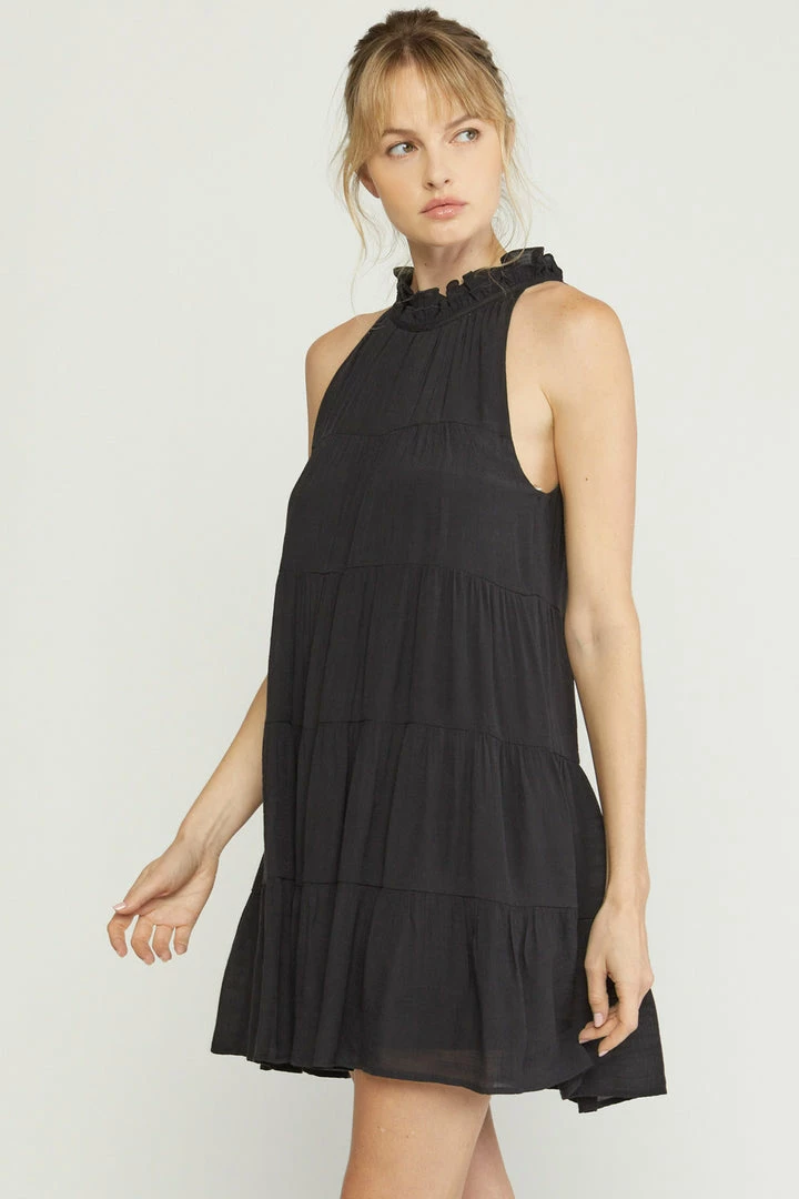 Black sleeveless tiered dress with mock neck