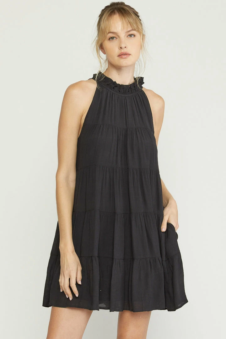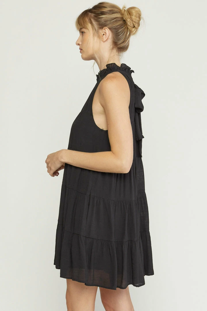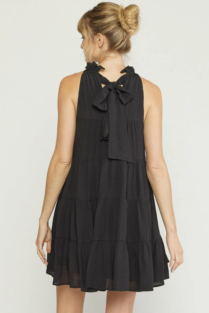 Flowy tiered dresses are all the rage right now and we are so here for it!! This adorable black dress is sleeveless and features a ruffled mock neck with self tie closure in back, and has pockets. Wear her alone on warm days, then pair with a denim jacket when the weather cools!