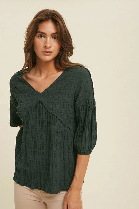 The perfect little babydoll top for all of your upcoming occasions… just add your favorite jeans and wedges or booties and you’re all set. Simple yet fabulous! Emerald green textured crinkle top with a v neckline, elastic cuffed 3/4 length balloon sleeves, and raw edge details. So cute!