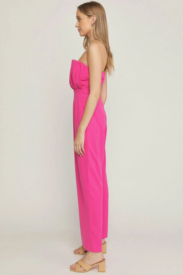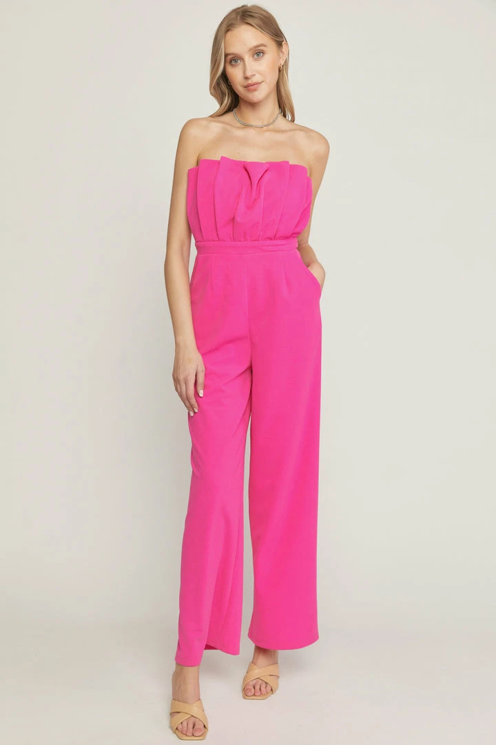 Yes we are obsessed with this pretty jumpsuit and will be too! It has all the dressy vibes featuring a pleated bust, with a strapless neckline. This babe also has flowy wide legs and pockets. Add your favorite shoes and jewelry and you’re ready for any occasion.