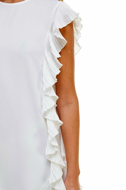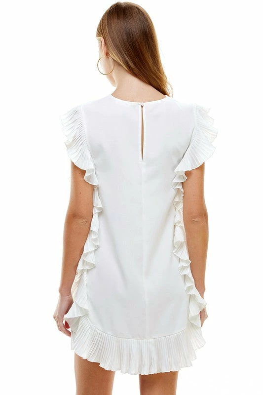 ย We know youโll be the life of the party in this stunning white party dress. Perfect for brides and all occasions. A woven dress featuring a round neckline, side ruffle trim and a back buttoned keyhole.