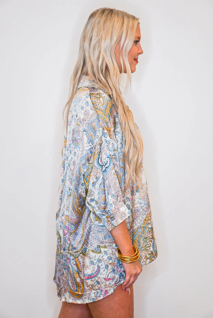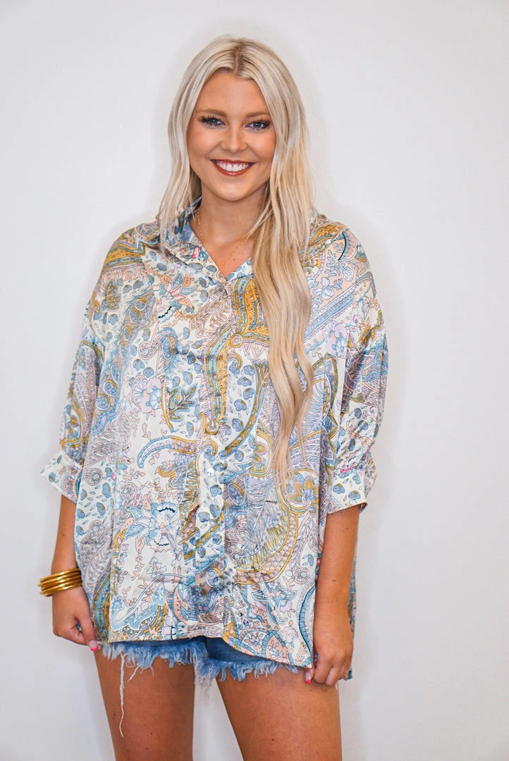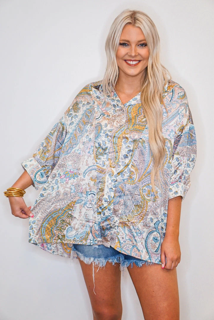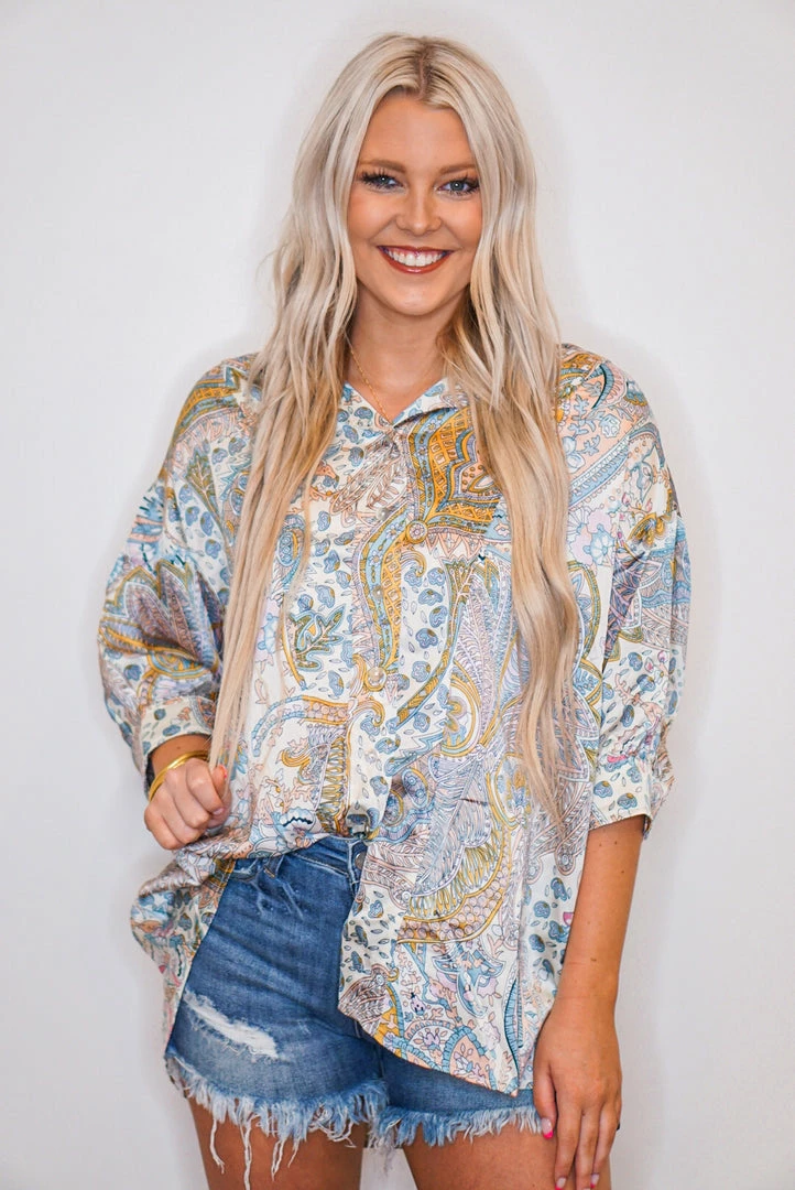 Sweet meets sassy in this super cute satin blouse. Featuring an ivory satin fabric with multicolor print in a buttoned down style, with a collar, button cuffed half sleeves, and a hi-low bottom hemline. This babe gives a really pretty twist to the classic buttoned down shirt! Colors: ivory, light pink, dark pink, light blue, dark blue, peach and yellow.