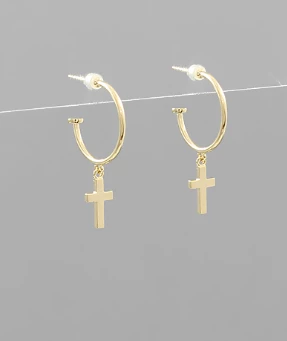 These are the sweetest hoop earrings! Small gold hoops with a dangling cross. Such a cute statement piece!