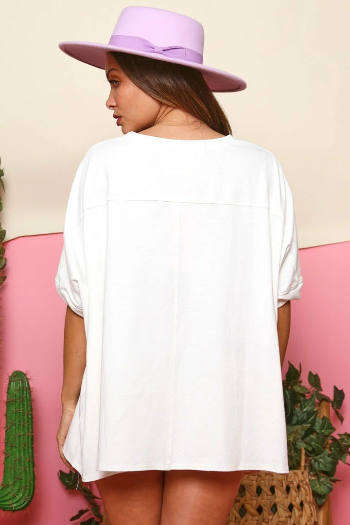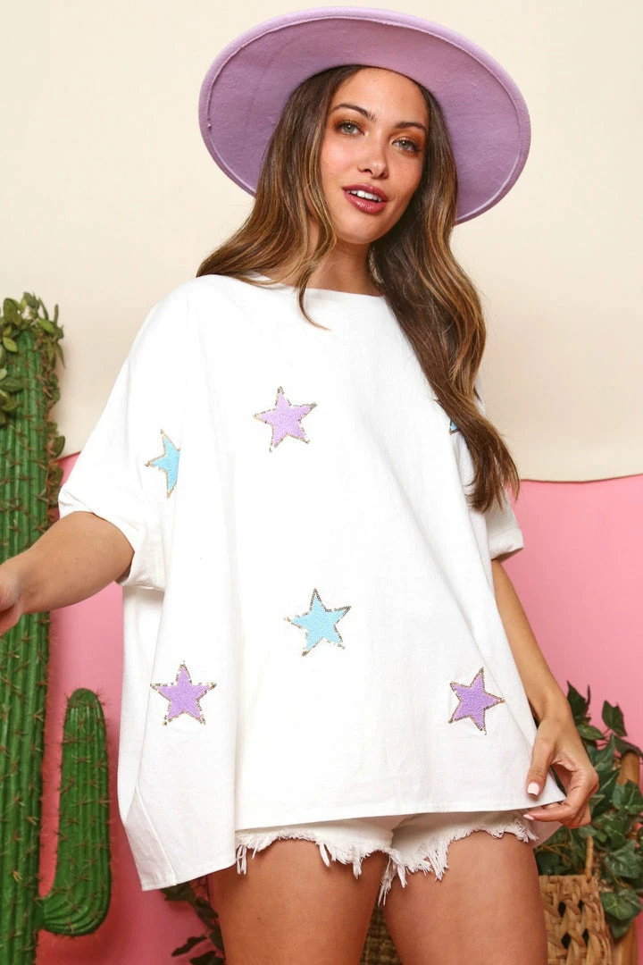 We love the oversized fit of this must have top and the patched stars decorating the front of it. This top is super cute styled with biker shorts or denim cut offs and sneakers. Star patch knit top with a round neckline, short sleeves, and loose fit.