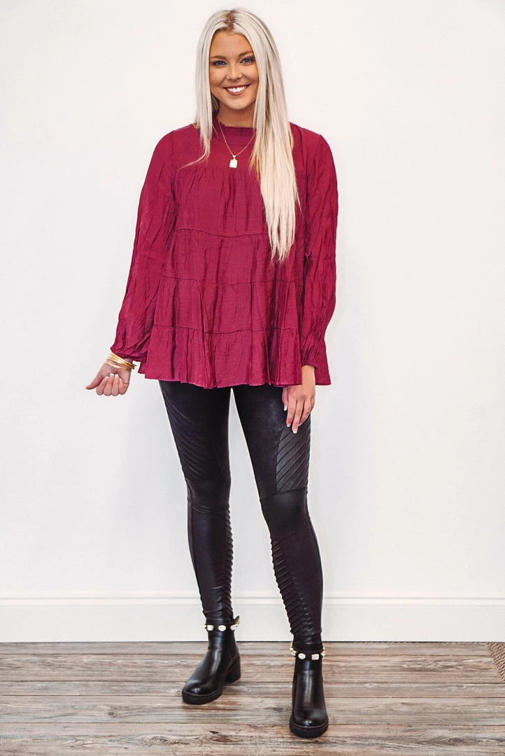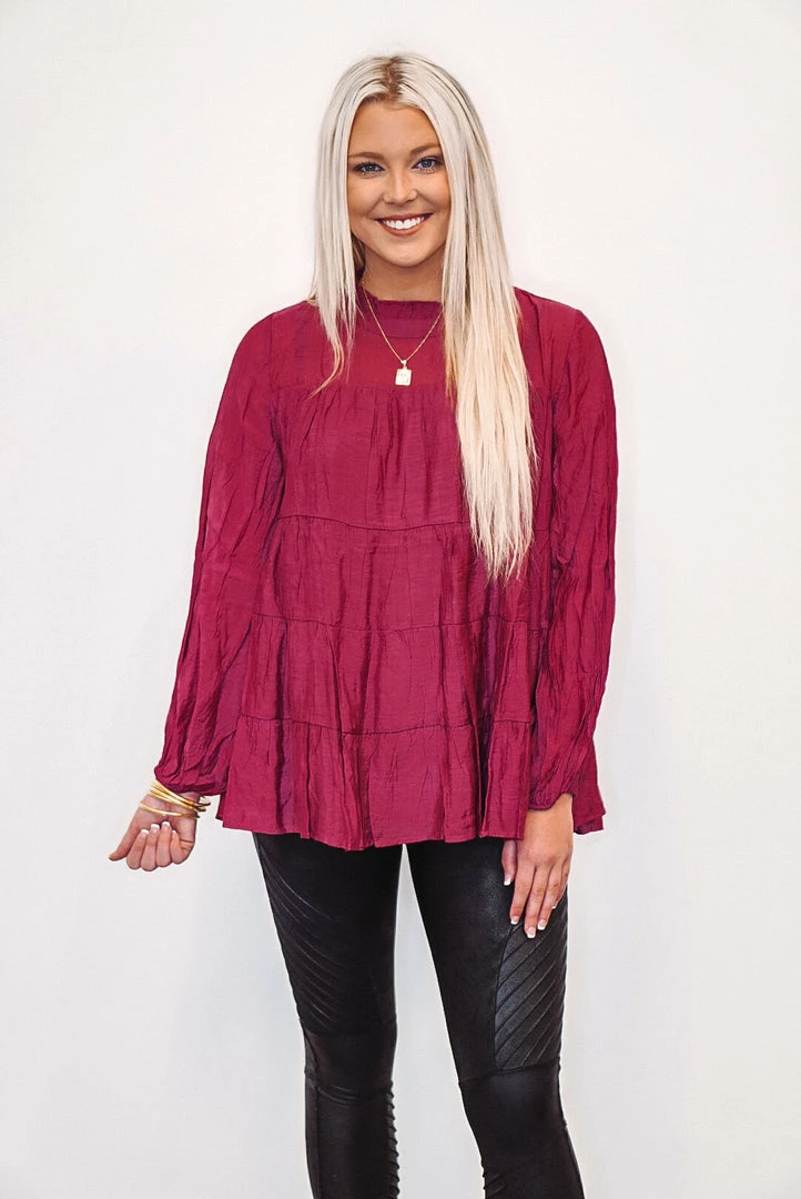 The perfect little top for all of your upcoming events… just add your favorite jeans and booties, or skirt and heels, and you’re all set for any occasion. Simple yet fabulous! Magenta top featuring a ruffled mock neckline with keyhole button closure in back, elastic cuffed long bubble sleeves, and tiered layers. So cute!