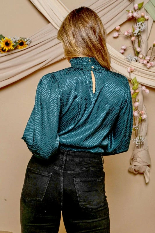 Women’s mock neck teal satin zebra print bodysuit