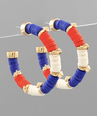 Beaded hoops are a must have this season! We are loving these US Flag red white and blue rubber beaded hoops with gold star bead accents. They are perfect for summer!