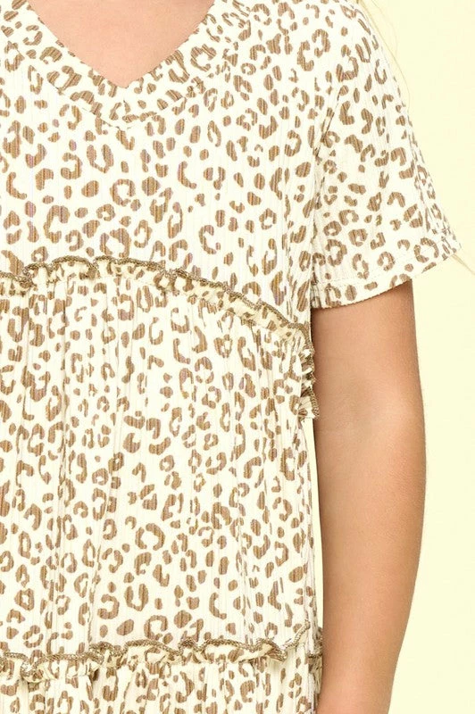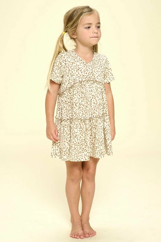 Your little one will love this cute babydoll dress! Leopard print ribbed fabric, featuring a v neckline, short sleeves, and ruffled tiers. So adorable!