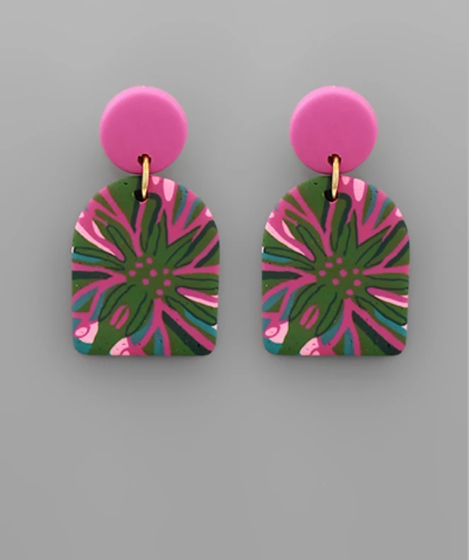 Our new fave earring we cannot get enough of!!! How cute is this pam leave print?! Dangle earrings feature a lightweight silicone material.