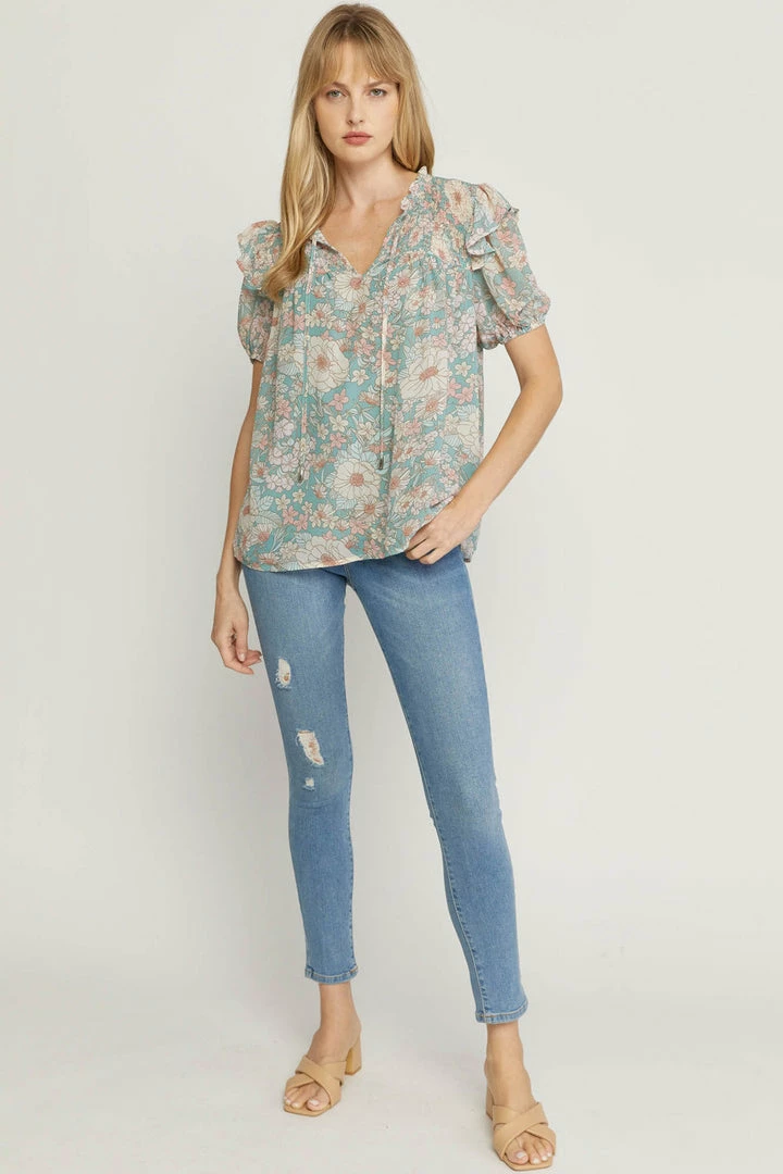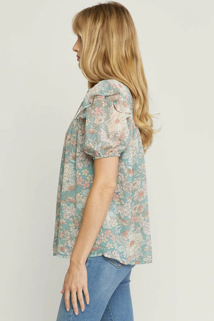 Seafoam green floral puff sleeve babydoll top