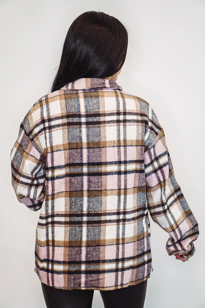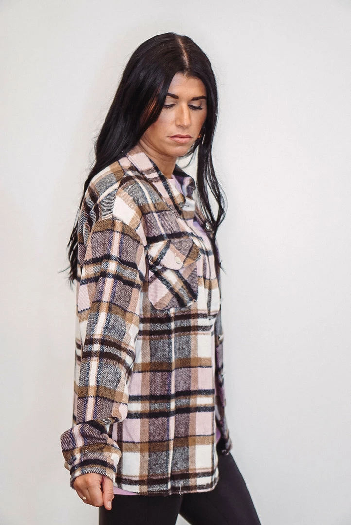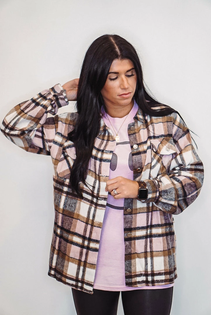 We are loving this pink, white and brown plaid flannel shacket, it’s a must have trend this season. It features soft fabric, button up style, button front chest pockets, and mid weight fabric to keep you warm and cozy. It’ll be the perfect addition to your wardrobe and great to layer with your bodysuits and jeans. We love the relaxed fit… this shacket is a must have!!