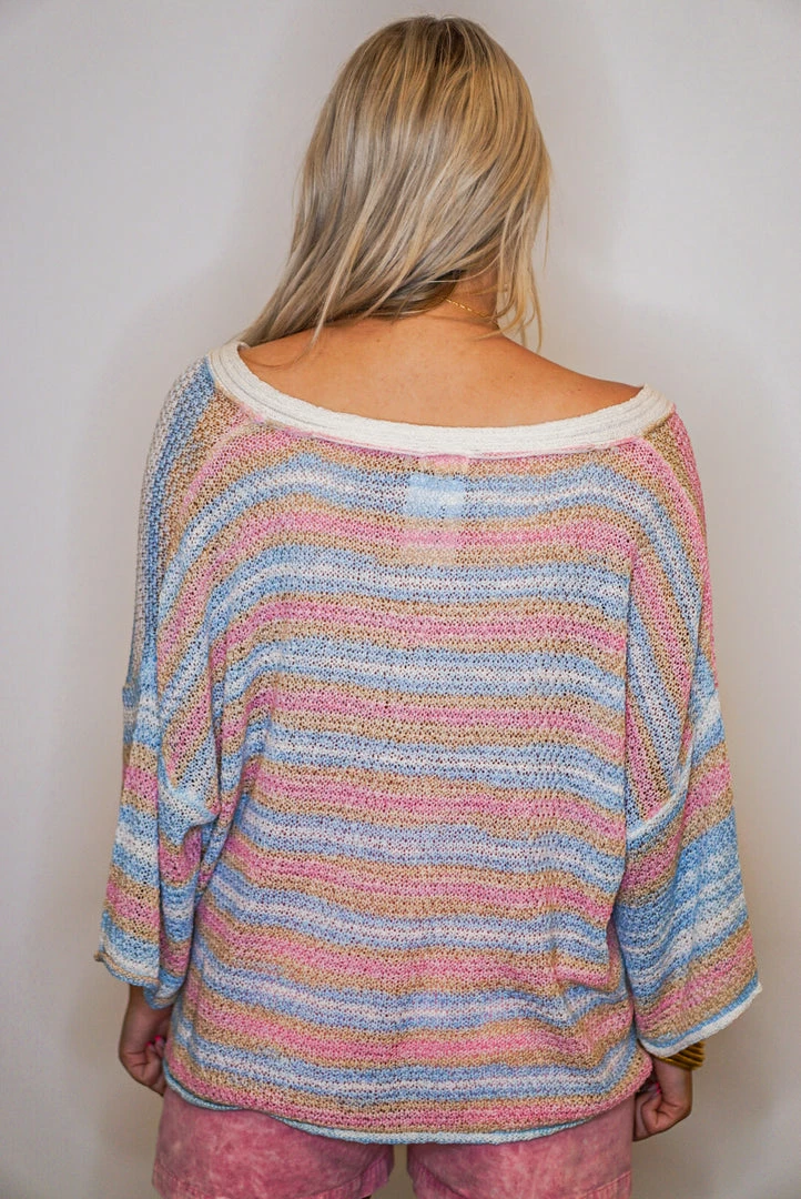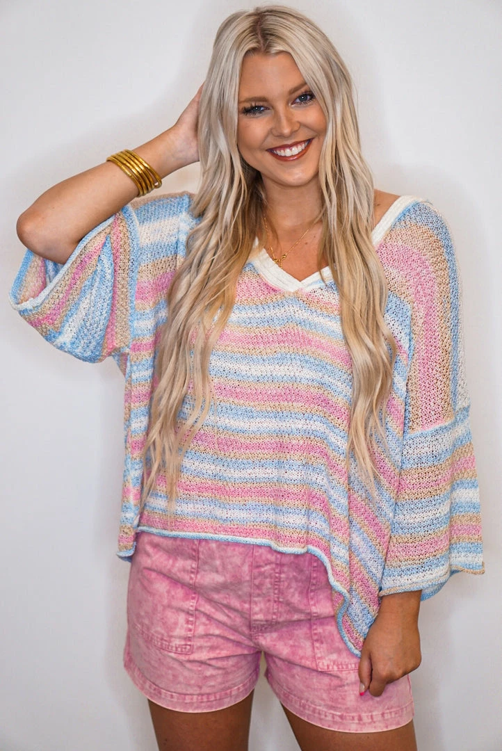 We are feeling all of the summer love with this adorable striped top! Featuring loose knit fabric with a wide v neckline, drop shoulder short sleeves, and rolled hemlines. The perfect top for those beachy Summer evenings! Colors: light pink, light blue, tan and white.