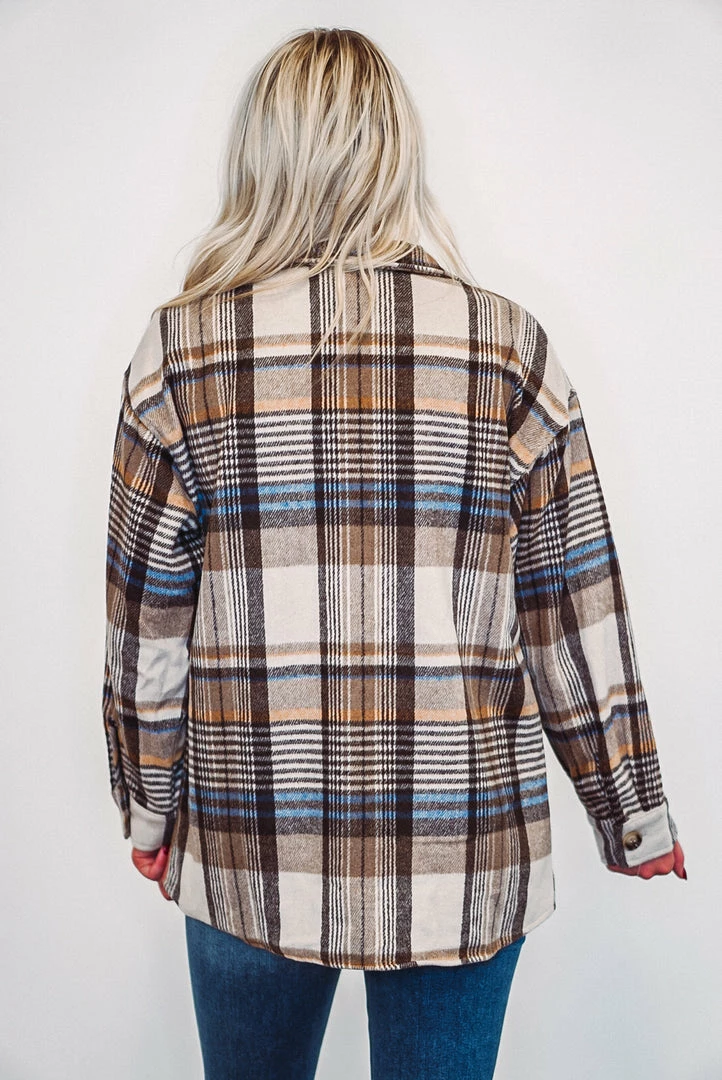 We are loving this brown plaid flannel shacket, it’s a must have trend this season! It features a button up style, button close two front chest pockets, and a thicker fabric to keep you warm and cozy. It’ll be the perfect addition to your wardrobe and great to layer with your bodysuits and jeans. Plaid colors are bown, tan, ivory, blue, and mustard…. a perfect combination!