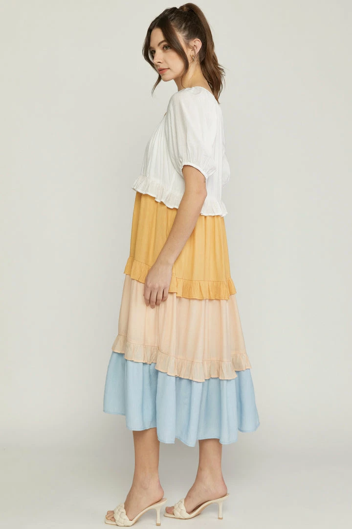 All the heart eyes for this pretty colorblock midi dress! Such an easy breezy fit that is cute and comfy. Dress has elastic cuffed short puff sleeves and features a relaxed silhouette, ruffled colorblock tiers, crew neckline, and pockets. Perfection! Colors: off white, dusty peach, pale pink, and light sky blue.
