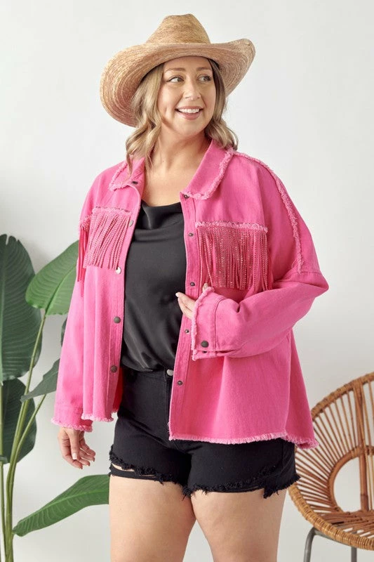 A fun, lightweight jacket with a TWIST! This hot pink twill jacket is a MUST have to rock all year long! Jacket features rhinestone fringe across the chest, raw frayed seam details, slight hi-low bottom hemline, and a comfy relaxed fit. This babe is absolute perfection!