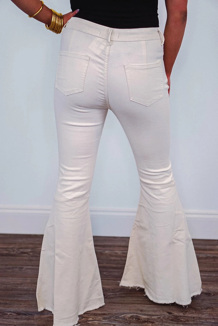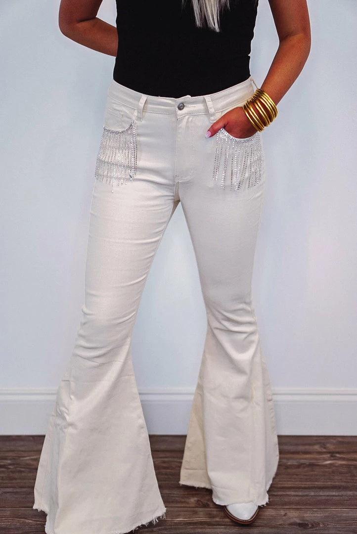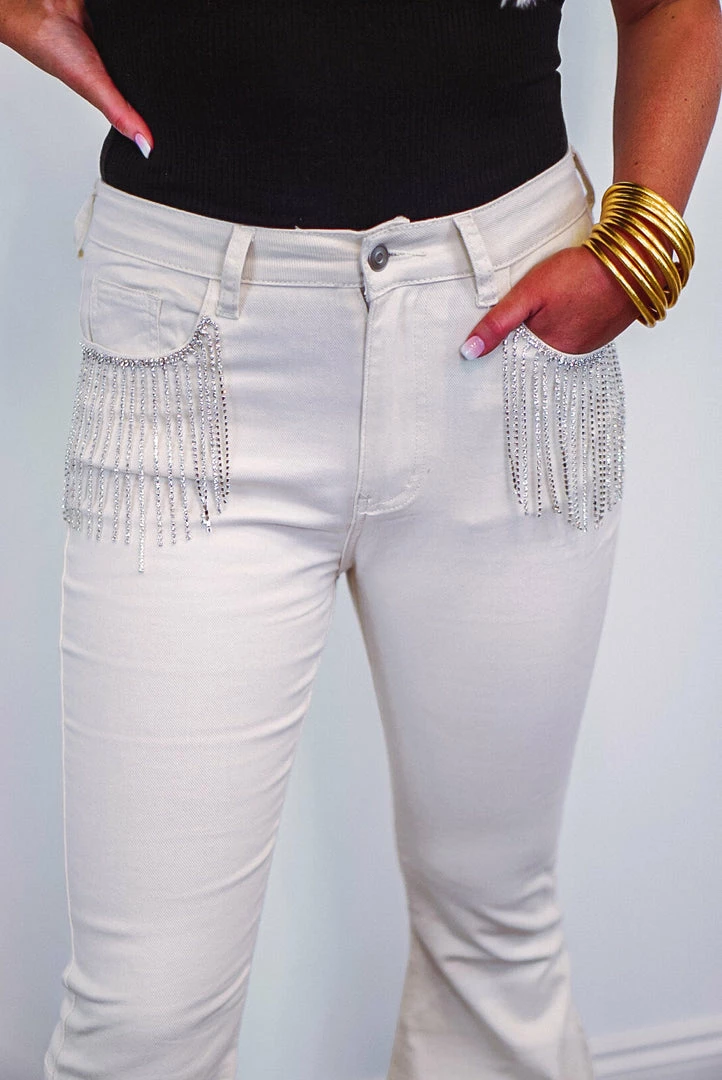 We love everything about these super cute denim flares! These babies are high waisted jeans in ivory denim with a flattering fit and flared cut. Featuring rhinestone fringe on the front pockets! They are a traditional button and zip fly closure with back pockets, and raw frayed bottom hemline on the flares. Perfect for all of those upcoming concerts and and special events!