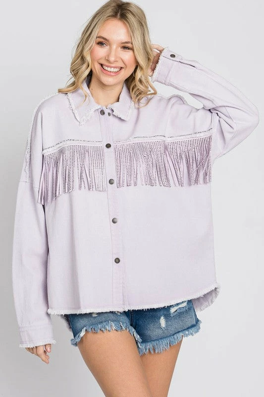 A fun, lightweight jacket with a TWIST! This lilac twill jacket is a MUST have to rock all year long! Jacket features rhinestone fringe across the chest, raw frayed seam details, slight hi-low bottom hemline, and a comfy relaxed fit. This babe is absolute perfection!
