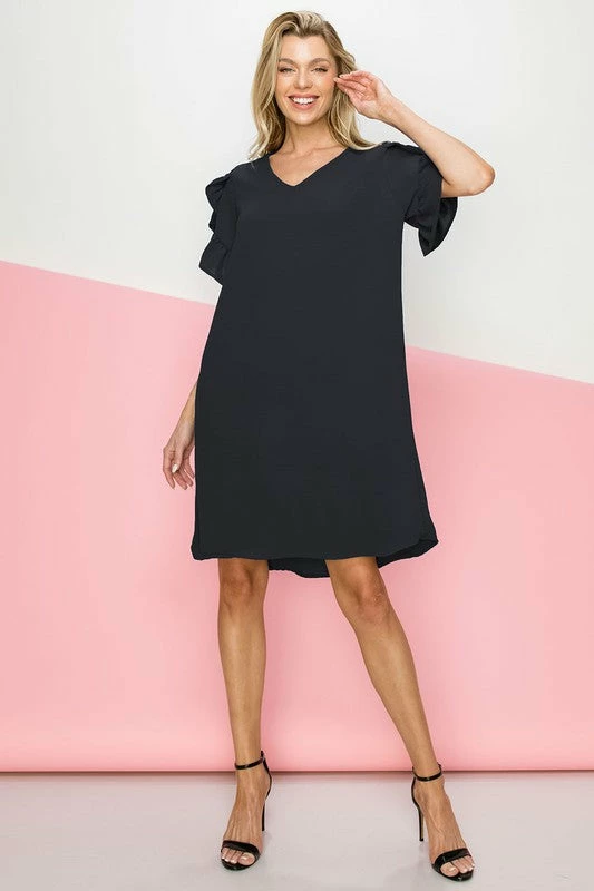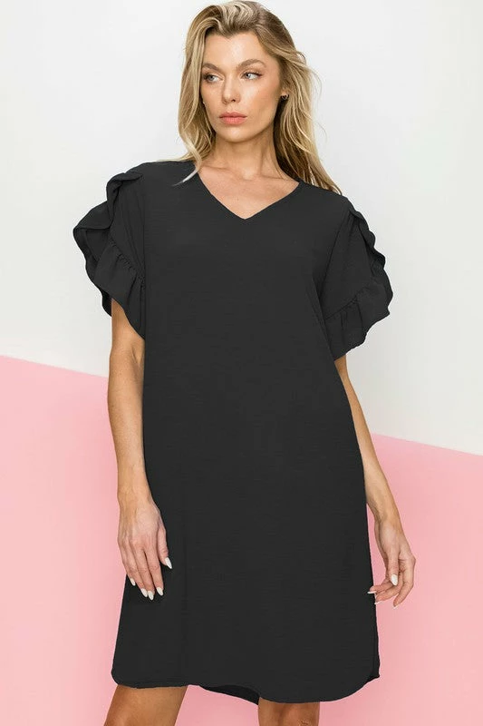 We LOVE a pretty shift dress!! This hot babe is black lightweight crinkle fabric, and features a v neckline and short ruffled sleeves. So very comfy, and perfect for any occasion – dressed up, or down!