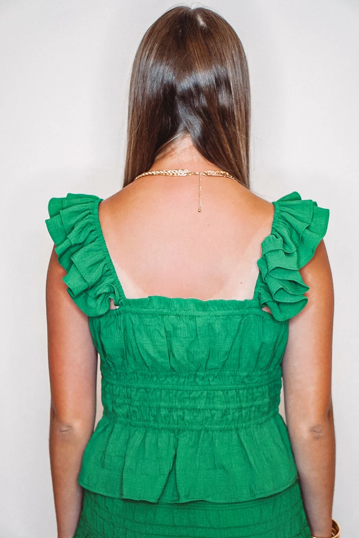 We are totally in LOVE with this green peplum blouse! This babe features a smocked bodice, ruffle trimmed square neckline, and elastic shoulder straps with ruffle details. Such a perfect top! Shop the matching skirt here! Also cute to mix & match with denim shorts or jeans.