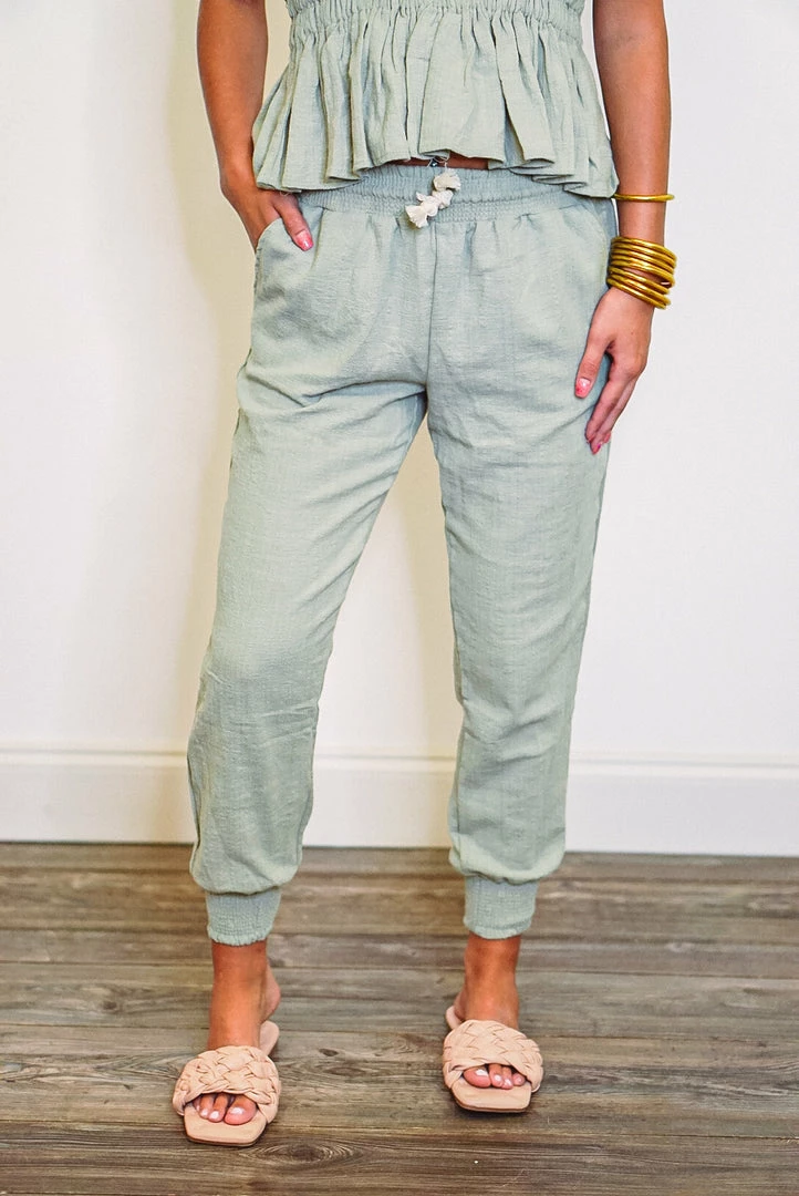 We love a good pair of jogger pants, and these babies are super cute! They are a lightweight fabric in soft olive, with an elastic waistband and rope cord drawstring, front pockets, and smocked cuffed ankles. These babes will have you feeling so comfy while looking fab, you’ll want to wear them everyday! Pair with the matching top for a super cute day out: Seaside Dreams Olive Halter Top.