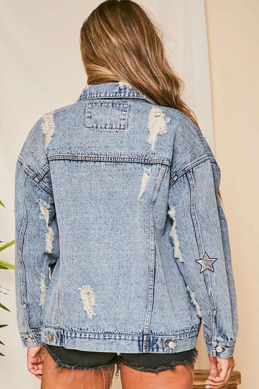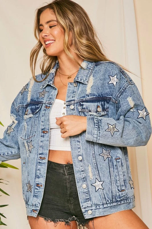 A timeless denim jacket with a TWIST! This blue jean denim jacket is a MUST have to rock all year long! Jacket features silver sequins stars, distressing throughout, front and side pockets.